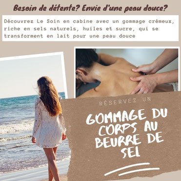 Un soin d'un heure avec un beurre de sel pour un gommage et un massage du corps laissant, sur la peau, une douceur inégalée!
